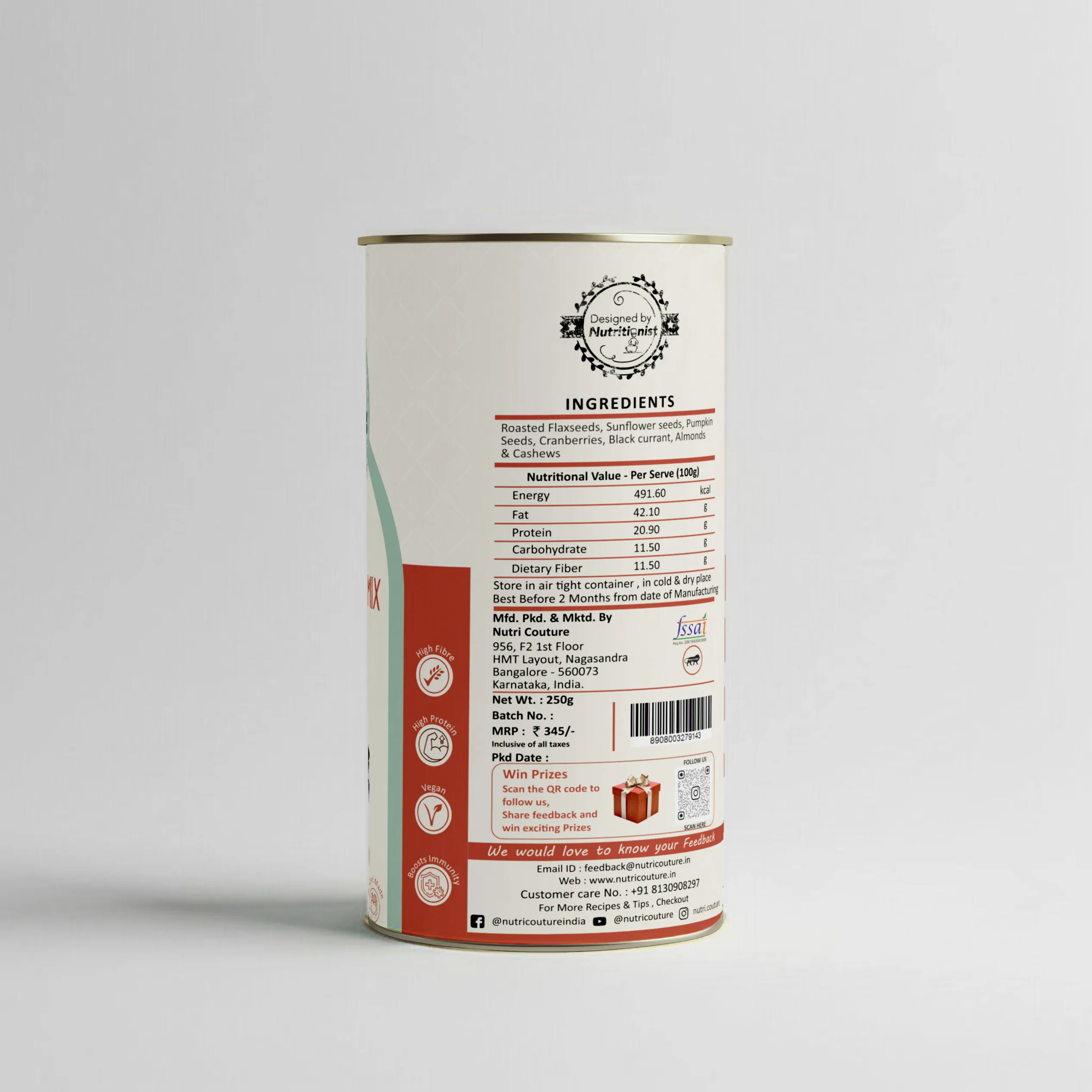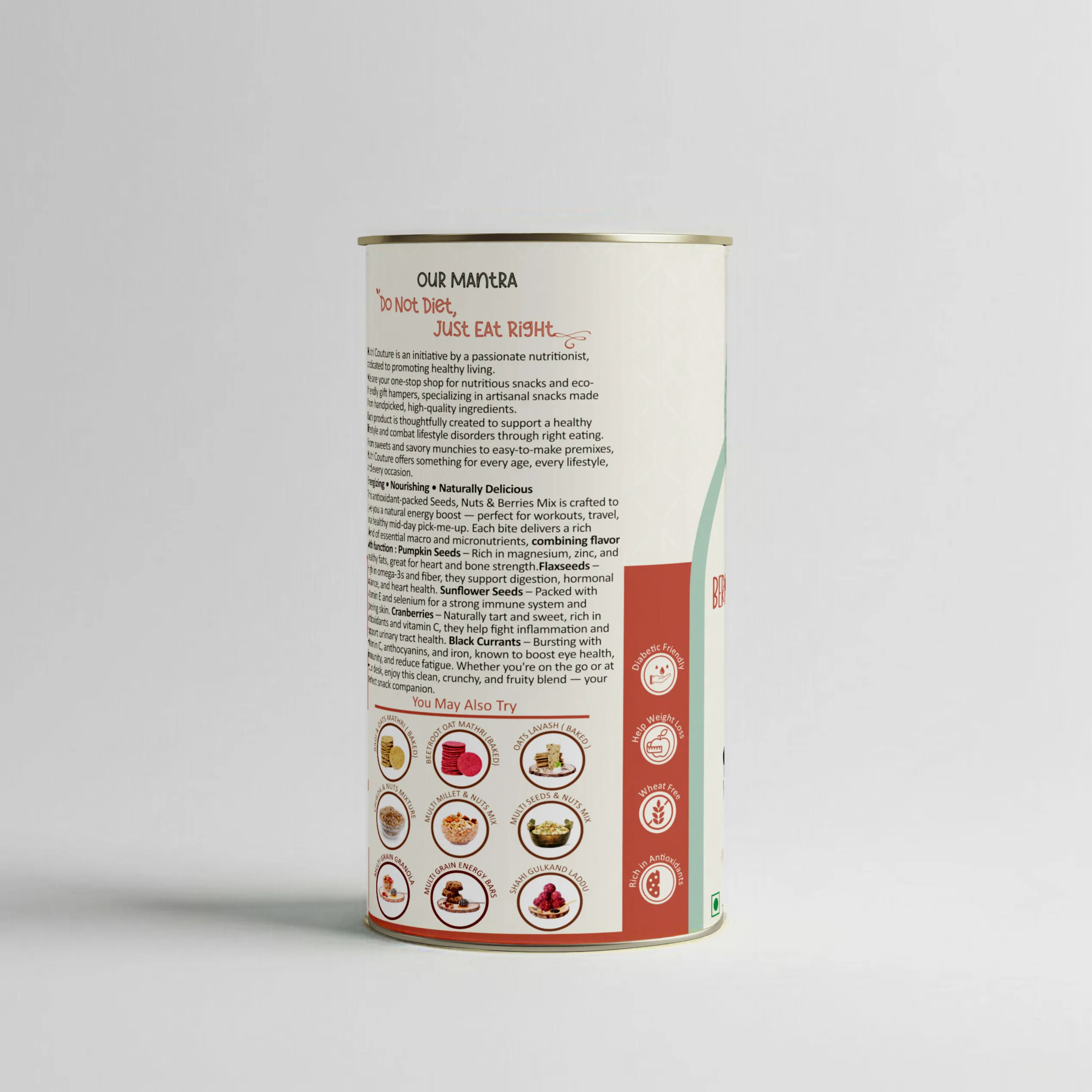 Nutri Couture’s Berrylicious Trail Mix is a wholesome blend of crunchy seeds, nutrient-dense nuts, and tangy-sweet dried cranberries — thoughtfully curated to offer a burst of energy, essential nutrients, and a delightful snacking experience.