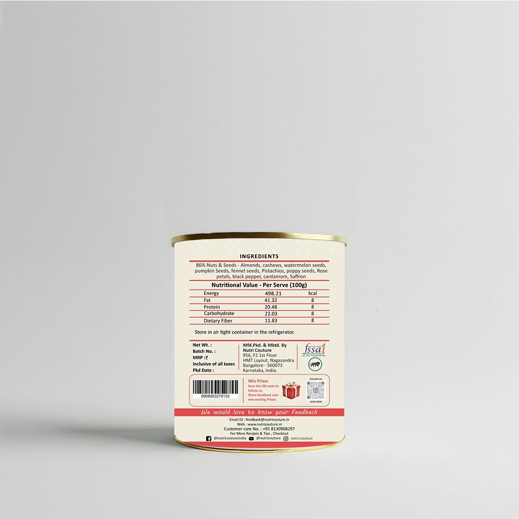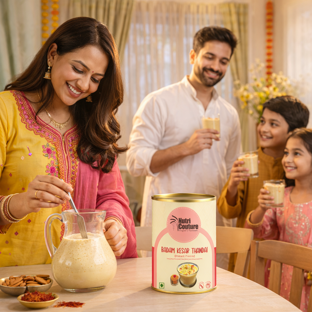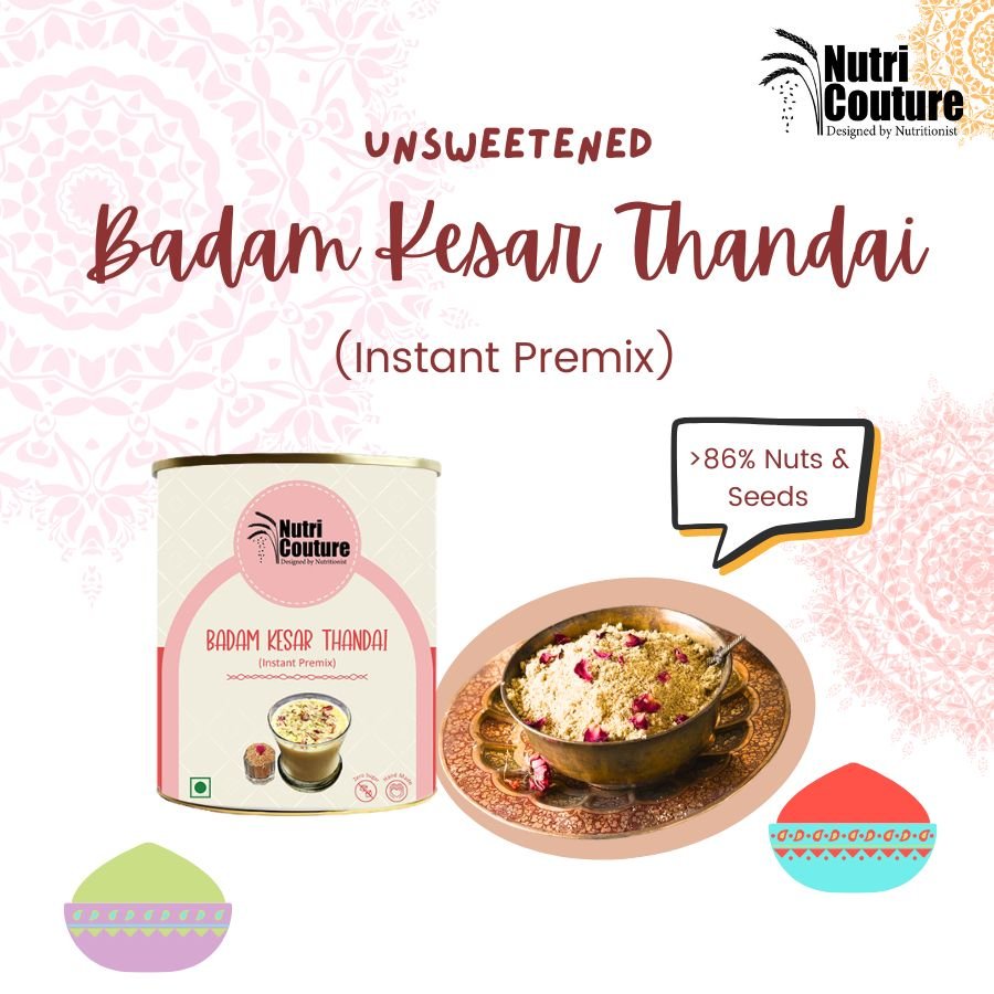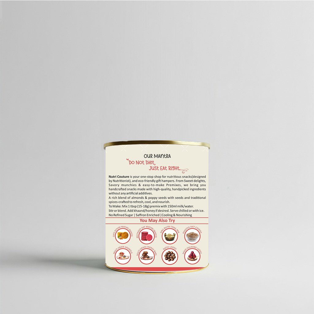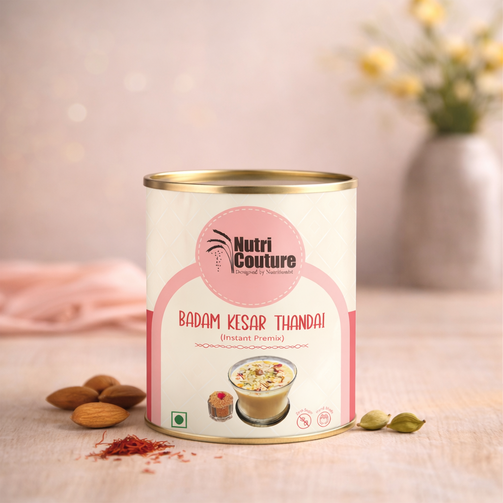 At Nutri Couture, we believe that every sip should nourish the body while honoring tradition. Our Badam Kesar Thandai is a thoughtfully crafted blend inspired by age-old Indian recipes, designed to bring together celebration, wellness, and purity in one glass. Made with an exceptional 86% premium nuts and seeds, this thandai offers a naturally rich, creamy texture and deep, authentic flavor without relying on artificial additives or sugary syrups. Infused with almonds, cashews, watermelon seeds, pumpkin seeds, pistachios, and poppy seeds, and delicately balanced with fennel, rose petals, black pepper, cardamom, and pure saffron, this blend delivers both indulgence and nourishment. Each ingredient is chosen not just for taste, but for its functional benefits — supporting digestion, sustained energy, and natural cooling during warmer months. Unlike commercial thandai concentrates loaded with refined sugar and synthetic flavors, Nutri Couture’s blend is completely clean and mindful. #NoRefined sugar, #NoPreservatives, We believe in ingredient integrity , What you get is pure, wholesome nutrition rooted in tradition and backed by conscious formulation. Whether enjoyed during Holi celebrations, served to guests as a festive welcome drink, or included in your daily summer routine, this Badam Kesar Thandai transforms an ordinary glass of milk into a royal, nourishing experience. It can also be blended into smoothies, plant-based milk, or festive desserts for a rich, aromatic twist. This is not just a drink mix — it is a celebration of heritage, health, and honest ingredients.