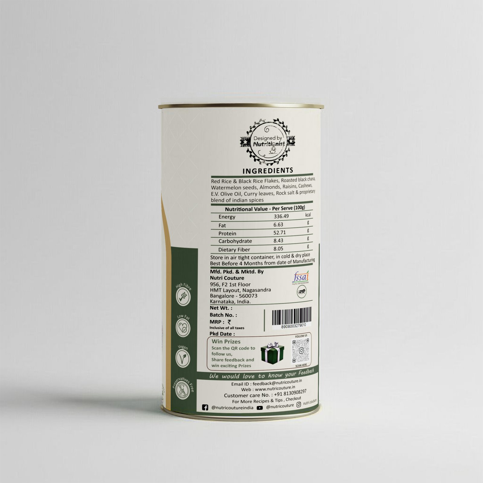 Unlike regular white rice chiwda, Nutricouture Roasted Diet Chiwda is crafted from red and black rice flakes — ancient grains with superior nutrition. Slow-roasted in cold-pressed olive oil, it combines tradition with health-conscious innovation, making it a smarter, guilt-free choice for mindful snacking.