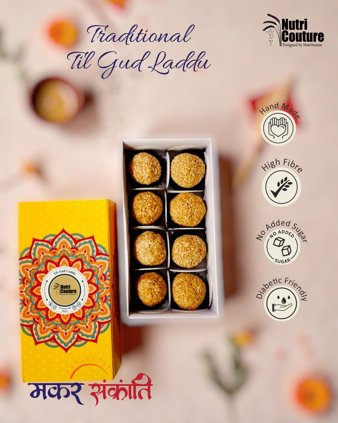 Traditional Til-Gud laddus made with roasted sesame seeds & jaggery No added sugar – naturally sweetened with gud No artificial preservatives or colours Handmade in small batches for authentic taste Rich in natural fibre & healthy fats Classic Makar Sankranti festive sweet No ghee, no refined ingredients Hygienically packed to retain freshness Ideal for festive gifting & family rituals Crafted by Nutri Couture – Designed by Nutritionist